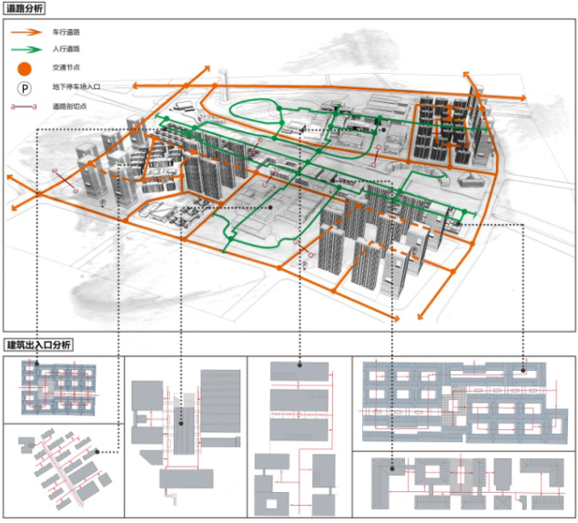 交通体系对之前的沿运河的机动车进行规划,改为人行道,在商业街的南侧另开一条机动车道,来解决中吴大桥下来的车流,在此基础上,开辟两条南北的机动车道,小区内部一般以“L”型来解决内部交通,小区内道路分为9、6、3m三个等级,其中三米的为人行入户路,高层公寓采用广场是铺地入口,解决人流与消防问题。