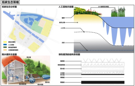 在方案中,我们也提出了能源概念对于新建的建筑,进行了屋顶绿化处理,增加了绿化率,并且配合水循环的处理,可以增加雨天吸水能力和储水能力,对于厂房和运河五号的大建筑以及住宅区的建筑,全部按照被动房的概念来建造,冬暖夏凉从而减少能源的浪费。尽可能的增加绿化植被的数量,减少地面硬质铺地。
