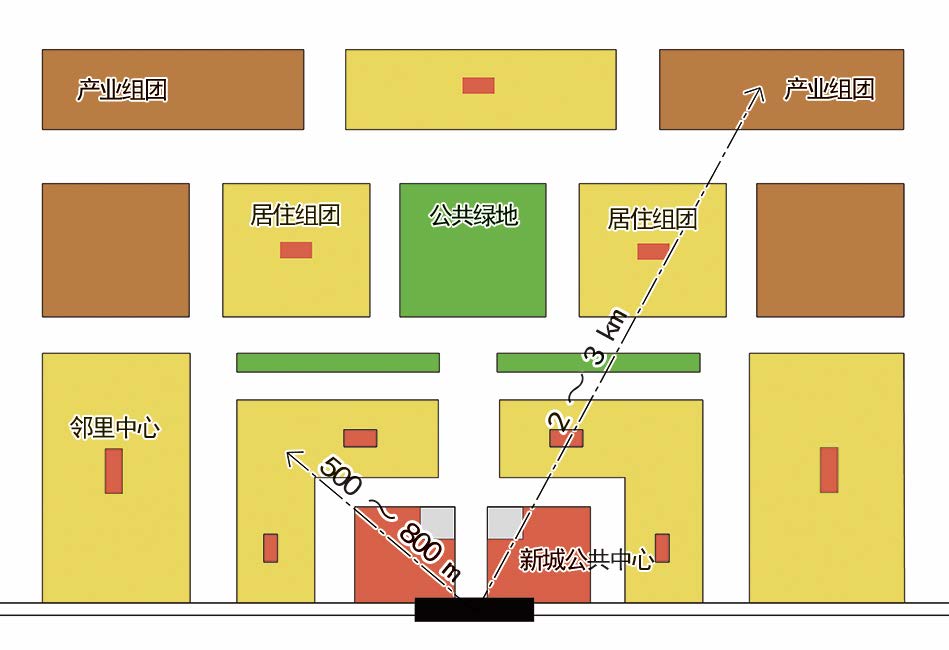 都市边缘区空白地的高铁站点由于不受现状建设的影响,对E-TOD 模式的打造相对更加容易,应充分结合站点功能定位,形成类终端式交通枢纽。用地布局应确保与站点功能的高度耦合,交通衔接设施就近高铁站点布置,并宜与商业、文化、教育等公共设施结合设置;应适当控制开发强度,构建具有宜人尺度与舒适环境的片区或组团公共中心;外围TOD 拓展范围宜采取较大规模的居住社区开发或产业开发形式,配置社区级服务中心,同时要强化新城的职住平衡,避免成为“空城”“卧城”;随着环境品质的提升,逐步吸引市区人口和周边人口在新区集聚,逐步形成城市新城组团。