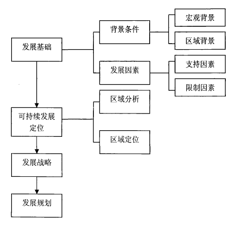 目前,地区可持续发展的战略决策的制定已经有一套明确的框架体系,本论文同样运用这个决策框架,该框架将制定地区可持续发展策略的实现过程分为发展的基础、可持续发展的定位、战略的制定与发展规划四个模块。