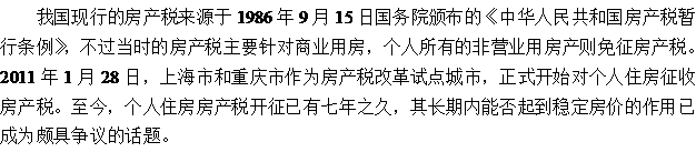 自20世纪90年代末进行房地产市场改革以来,我国房地产业开始前所未有地迅速发展。而自2000年开始,我国房地产市场价格更是屡创新高,房价高企。为抑制房价过快增长,国家先后推出了许多宏观调控政策,以通过调控房地产市场供给量和需求量从而达到调控房价的目的。调控市场供给方面,如减免税费、调整住房供应结构、加强保障性住房的建设等;调控市场需求方面,如限购限贷、提高首付比例等。不过以上政策都是在房地产流通环节对房地产市场进行调控,房产税是我国第一个在房地产保有环节实施的调控政策。