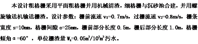 粗格栅外形尺寸为:L×B×H=2.3×1.1×0.9m则粗格栅间外形尺寸按远期设置为:L’×B’×H=2.3×5.6×0.9m。粗格栅除污机近期选用两台GH-1100回转式格栅除污机,远期选用四台栅渣采用带式输送机输送。