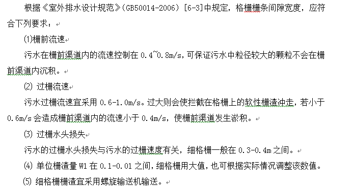 ⑼ 通过格栅的水头损失,粗格栅一般为0.2m,细格栅一般为0.3-0.4m。