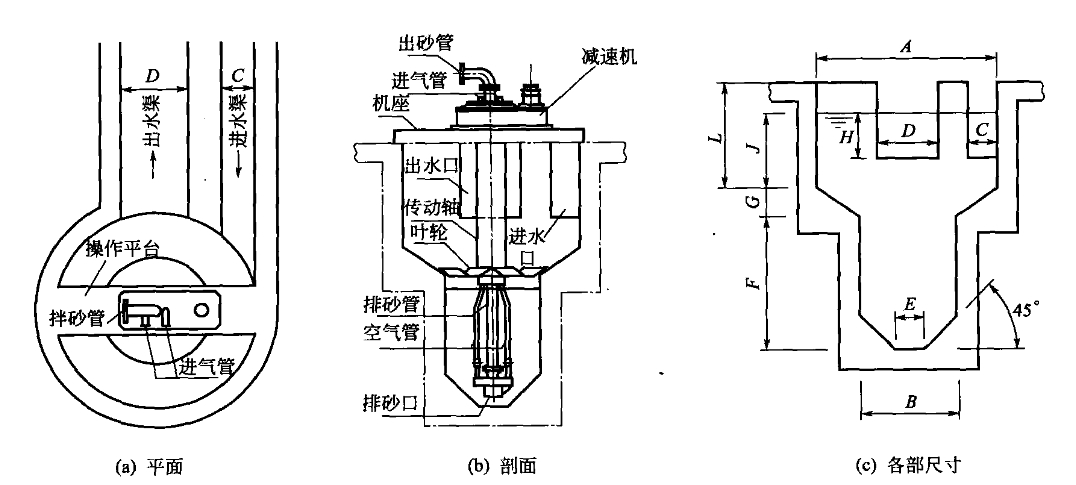 格栅选用2台无锡通用机械厂GH型链条式回转格栅除污机[19]。所选设备的技术参数为:选用GH-800型,格栅宽度800mm,有效栅宽500mm,槽深H=1.5m,安装角度60°,栅条间隙20mm,设备总长3982mm,电动机功率0.75。