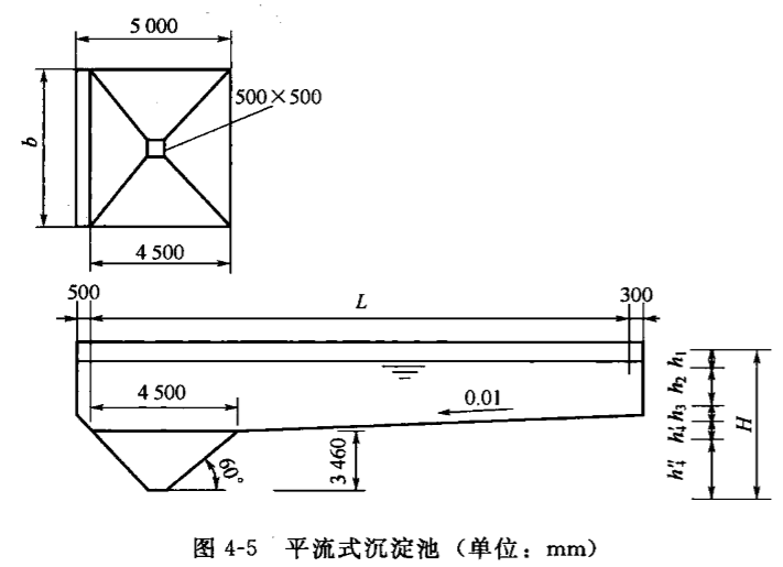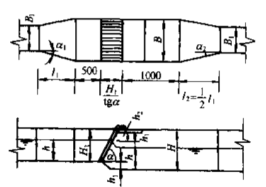 根据给排水设计手册第五册·城镇排水5.1.1取渐宽部分展开角度α1=20°,则渐宽部位L1: |