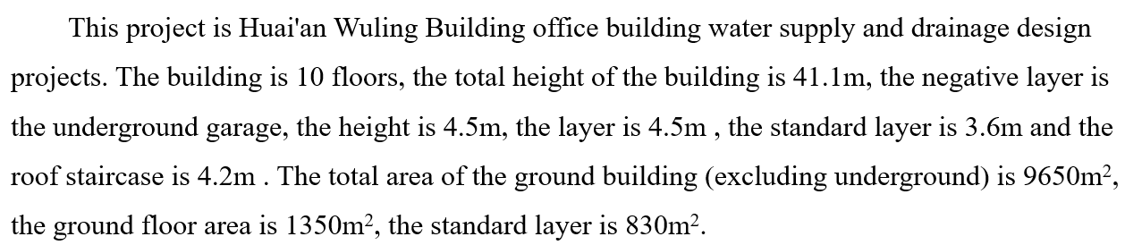 该项目为常州高级中学教师公寓楼设计,建筑总高度41.5米,其中地上十层、地下一层。建筑功能:一层为商业区,二至十层为教师宿舍区,地下一层为停车区及建筑设备区。 (1)给水水源:本建筑以城市市政给水管网作为水源,从市政管网取水,供水水压为0.28MPa。 (2)排水条件:建筑采用合流排水体制,污水可直接排入城市排水管网集中送至污水处理厂。 |