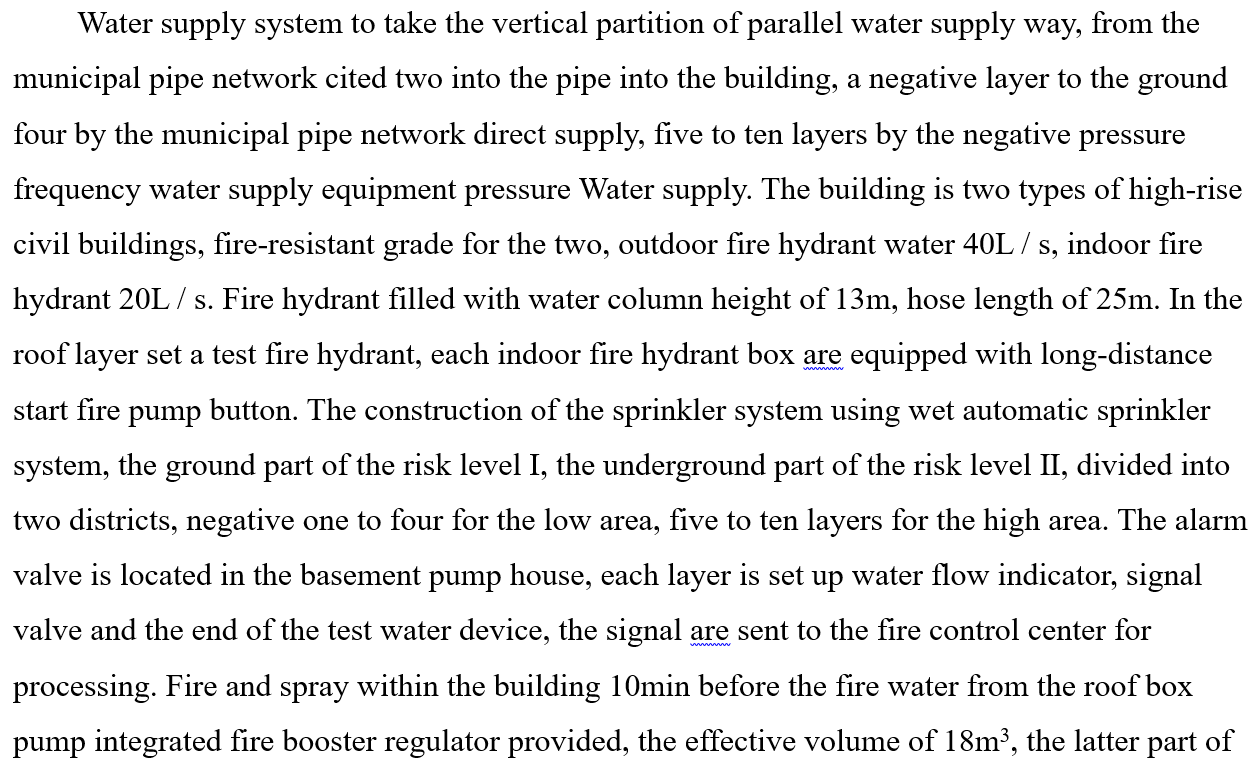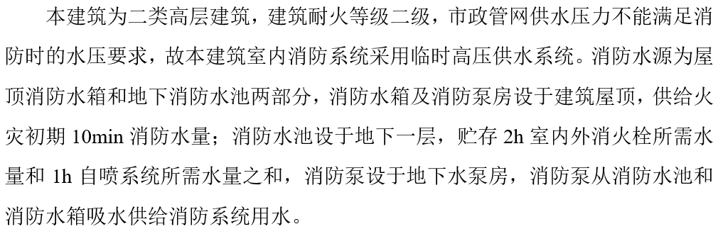 给水系统采取垂直分区并联给水的方式,从市政管网引两根引入管进入建筑,负一层至地上三层由市政管网直供,四层至十层由无负压变频供水设备加压供水。本建筑属于二类高层民用建筑,耐火等级为二级,室外消火栓用水量
