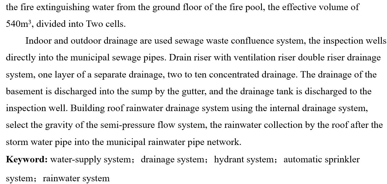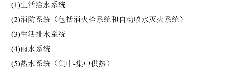 关键词:给水系统 排水系统 消火栓系统 自动喷水灭火系统 雨水系统