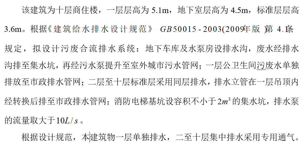 室内外排水均采用污废合流制,经检查井直接排入市政污水管。排水立管采用通气立管的双立管排水系统,其中一层单独排水,二至十层集中排水。地下室排水经排水沟汇集排至集水坑,经潜污泵提升排至检查井。建筑屋面雨水排水系统采用内排水系统,选择重力半有压流系统,雨水经屋面雨水斗收集后由雨水立管排入市政雨水管网。