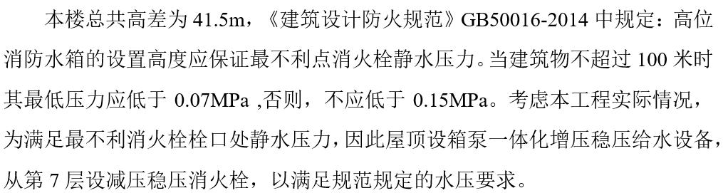 。消火栓充实水柱高度13m,水龙带长度25m。在屋顶层设试验消火栓一个,每个室内消火栓箱内均设有远距离启动消防泵的按钮。本建筑喷淋系统采用湿式自动喷水灭火系统,地上部分为中危Ⅰ级,地下部分为中危Ⅱ级,分两个区,负一至四层为低区,五至十层为高区。报警阀设于地下室泵房内,各层均设水流指示器、信号阀和末端试水装置,其信号均送入消防控制中心进行处理。建筑内消防及喷淋在火灾前10min用水由屋面箱泵一体化消防增压稳压设提供,有效容积为