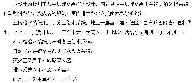 This design is a water supply and drainage design for a high-rise building in Yangzhou. It includes water supply system, hydrant system, automatic sprinkler system, fire extinguisher preparation, indoor drainage system and rainwater system design.