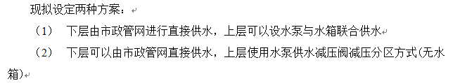 方案二 | 供水可靠,水压较为稳定。设备与管材较少,减少结构负担。省去水箱占地面积 | 下区水压损失大,较为耗能,投资较大 |
