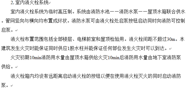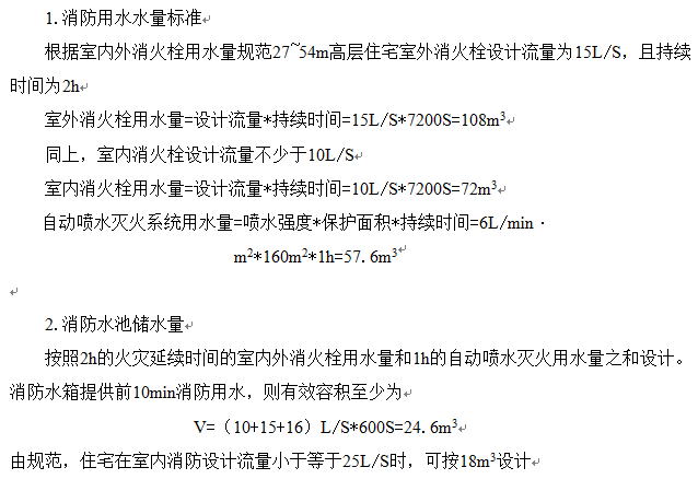 高层建筑必须设置室内外的消火栓给水系统,本设计将采用消防水泵和屋顶水箱联合供水的方式,消防水池设于地下一层。消火栓应尽量靠近立管。室外给水管道应布置成环状,以增加系统的安全性。本建筑高度47m宜采用消防水泵和屋顶消防水箱联合供水消防水池设于地下室。室外消火栓用水量为15L/S室内消火栓用水量为10L/S每根竖管的最小流量是10L/S每只水枪的最小流量是10L/S火灾延续时间为2h/S。室内消防栓的间距
