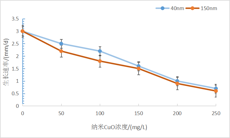 - The growth and metabolisms (carbon and phosphorus) of E. salonis was significantly correlated with the concentrations of nano-copper oxide with different particle sizes. Under 40 nm nano-copper oxide stress, the mycelial growth, carbon and phosphorus utilization of E. salmonis were inhibited less under mild stress (10-100 mg/l) than under severe stress (150-250 mg/l). Under 150 nm nano-copper oxide stress, the mycelial growth, carbon and phosphorus utilization of E. salmonis were significantly (P<0.05) inhibited both at mild stress (10-100 mg/l) and severe stress (150-250 mg/l).