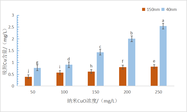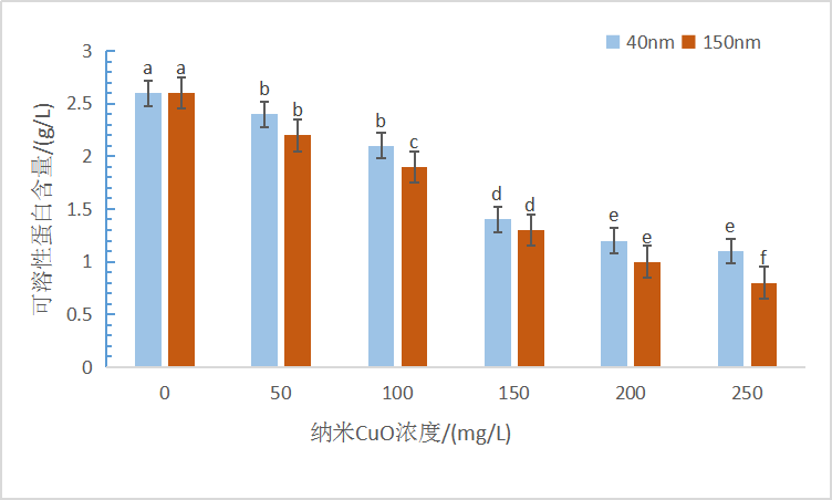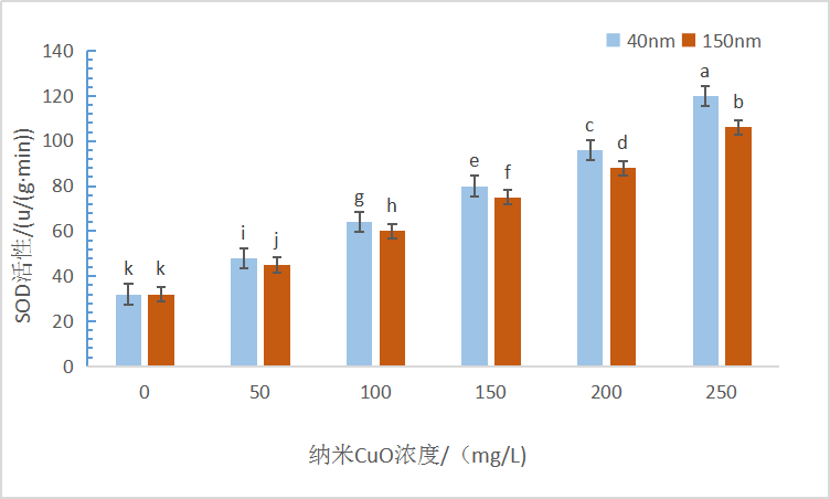 2)High concentration (150-250 mg/l) of nano-copper oxide significantly inhibited the growth of E. salmonis, resulting in the decrease of soluble protein content. The activities of superoxide dismutase, peroxidase and catalase increased significantly with the increase of nano-copper oxide concentration. Compared to 150 nm nano-copper oxide, the enzyme activities of E. salmonis under 40 nm nano-copper oxide stress increased significantly, which indicated that E. salmonis showed more resistance to 40 nm nano-copper oxide.
