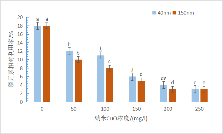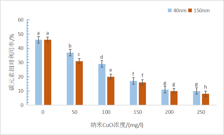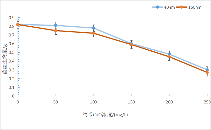 (1)沙门外瓶柄霉生长、碳、磷代谢和不同粒径纳米CuO浓度呈现显著相关性,在40 nm粒径的纳米CuO胁迫下,低浓度(10-100 mg/l)胁迫时沙门外瓶柄霉菌丝生长和碳磷利用受抑制程度不显著,高浓度(150-250 mg/l)胁迫时相比于对照受抑制程度显著(P<0.05);在150 nm粒径的纳米CuO胁迫下,低浓度(10-100 mg/l)和高浓度(150-250 mg/l)胁迫均显著抑制了沙门外瓶柄霉的生长(P<0.05)。