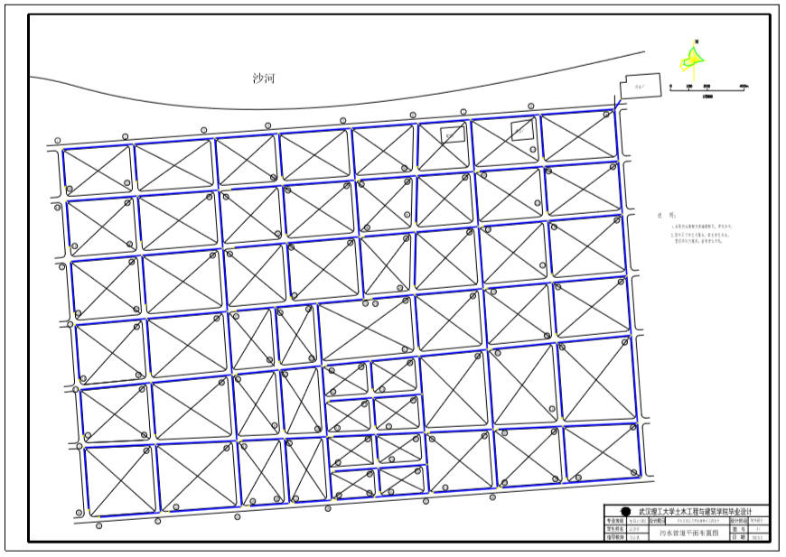 (2)综合安装管道,确定道路横穿面与平面管道的位置,确定坑道定位及每个管道的长度,绘制污水管网平面图;
