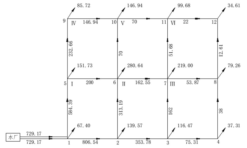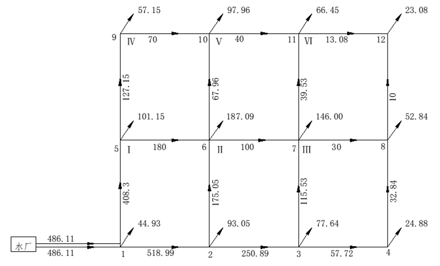 校正后的管段流量:设图上校正流量以顺时针为正,逆时针为负,凡是流向和校正流量方向相同的管段,加上校正流量,反之减去校正流量[5]。