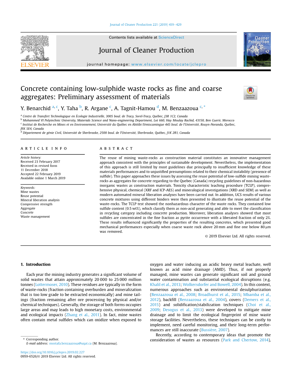 Benarchid a, c,Y.Taha b,R.Argane c,A.Tagnit-Hamou d,M.Benzaazoua c