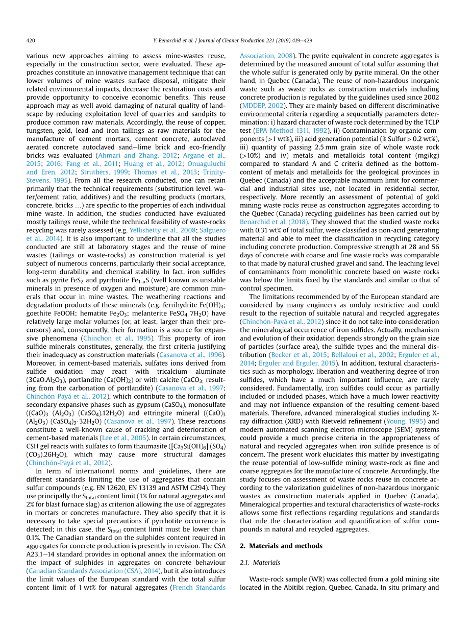 欧洲标准推荐的限制是被许多工程师认为是过度限制的,并且可能导致天然和再生骨料的相互排斥(Chincho#39;n-Pay#39;et al.,2012),因为它没有考虑到硫化铁的矿物学发生。实际上,氧化的机理和演变很大程度上取决于颗粒的粒度(表面积),硫化物类型和矿物分布(Becker等,2015; Bellaloui等,2002; Erguler等,014;Erguler和Erguler,2015)。此外,很少考虑具有重要影响的结构特征如硫化铁的形态,释放和风化程度。基本上,硫化铁可以作为部分包含或包含的相出现,其具有很低的反应性并且可以不影响所得水泥基材料的膨胀。因此,当硫化铁存在受到关注时,先进的矿物学研究,包括X射线衍射(XRD)和Rietveld精修(Young,1995)和现代自动扫描电子显微镜(SEM)系统,可以为天然和再生骨料的适当性提供更精确的标准。目前的工作通过研究低硫化物开采废石作为混凝土制造的细骨料和粗骨料的再利用潜力来阐明这一问题。因此,该研究的重点是根据魁北克(加拿大)应用的建筑材料中无害无机废物的增值指南评估混凝土中废石的再利用。废石的矿物学特性和结构特征允许对规则和标准进行初步反思,这些规则和标准规定了天然和再生骨料中硫化合物的表征和定量。