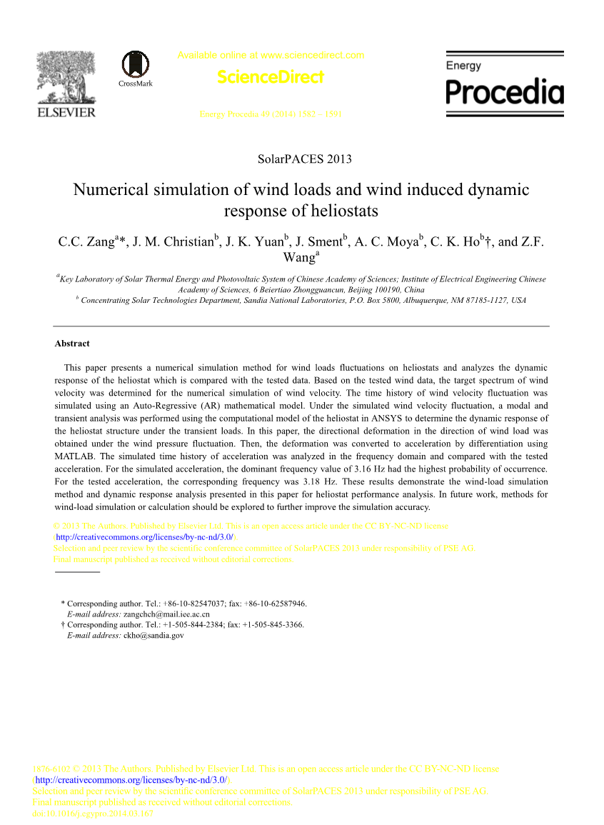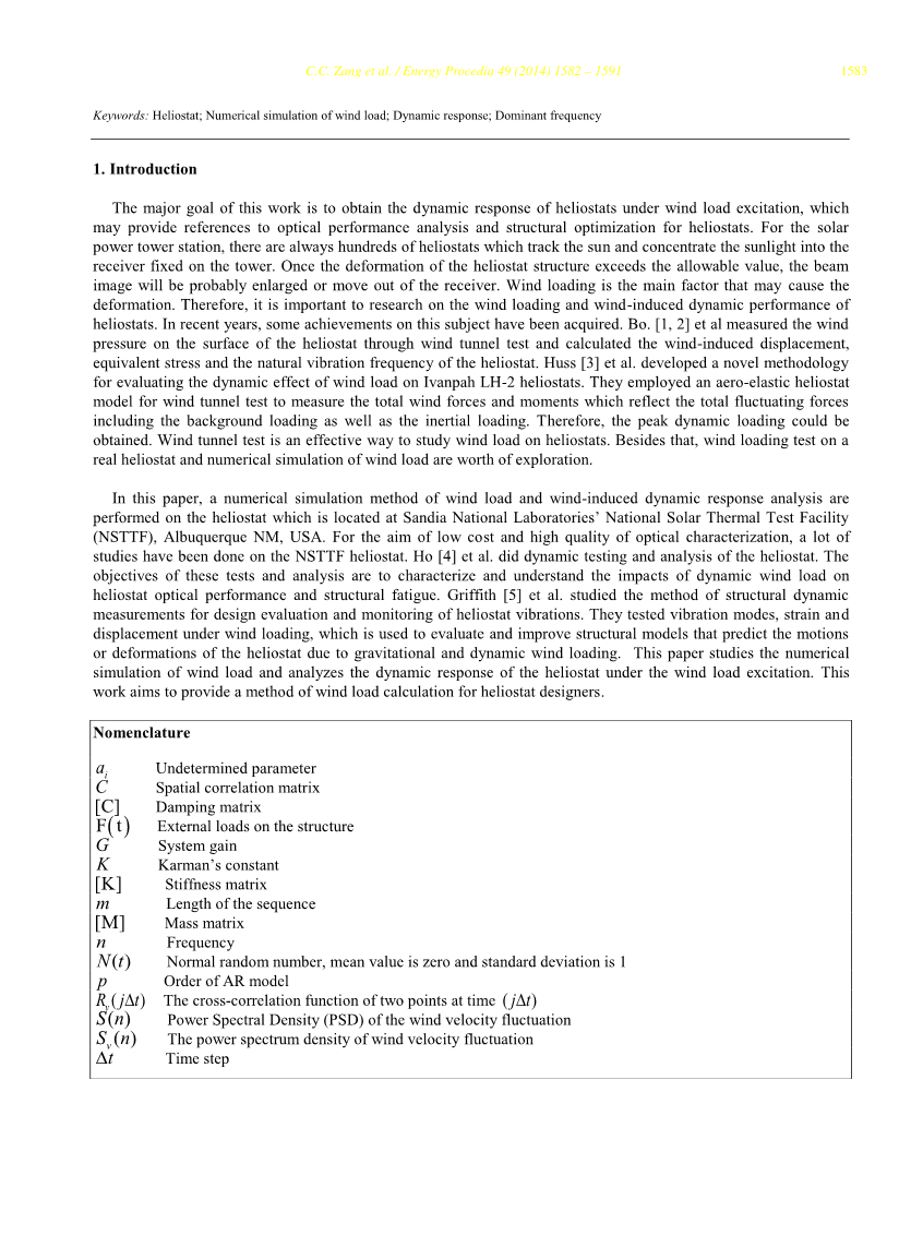 这项工作的主要目标是为了获得定日镜在风荷载激励下的动态响应,为涉及到定日镜的光学性能分析和结构优化可以提供参考。对于太阳能发电站,总是有数百个追踪太阳并将太阳光集中到固定在塔上的接收器中的定日镜。一旦定日镜结构的变形超过允许值,光束图像可能被扩大或者移出接收器。风荷载是可能导致变形的主要因素。因此,研究定日镜上的风荷载和风致动力性能十分重要。近年来,这方面已经取得了一些成就。Bo.[1,2]等人通过风洞试验测量了定日镜表面的风压,并计算了定日镜的风致位移、等效应力和固有震动频率。Huss[3]等人开发了一种用于评估风荷载对伊万帕LH - 2定日镜动态影响的新方法。他们采用气动弹性定日镜模型来进行风洞试验,测量了为了反应总的波动力的总风力和力矩,包括背景载荷以及惯性载荷。因此,峰值动载荷可以得到。风洞试验是一种研究定日镜上的风荷载的有效方法。此外,真实定日镜上的风荷载试验和风荷载的数值模拟也值得探索。