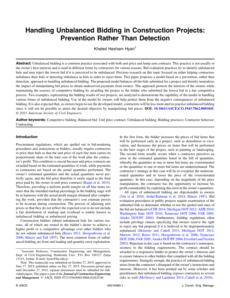 招标文件中详细说明的采购规定程序和投标人须知,通常要求承包商对他们的投标进行定价,使每一行项目的单价都能体现其价值工程总成本加上承包商利润的比例份额。这一条件至关重要,因为单价合同根据估计的工程量授予,同时支付向承包商支付的费用以实际执行的工程量为基础。这个业主估算的工程量和实际工程量并不完全一致,因此投标价格很少等于最终价格业主在单价合同中支付的价格(Bajari等人,2014年)。因此,在所有行项目上提供统一的利润率可确保在投标阶段的预期加价百分比如果承包商的成本估算证明施工时要准确。调整单元的过程价格,使其不反映预期成本或不包括公平分配标记和开销是众所周知的不平衡投标或不平衡定价。