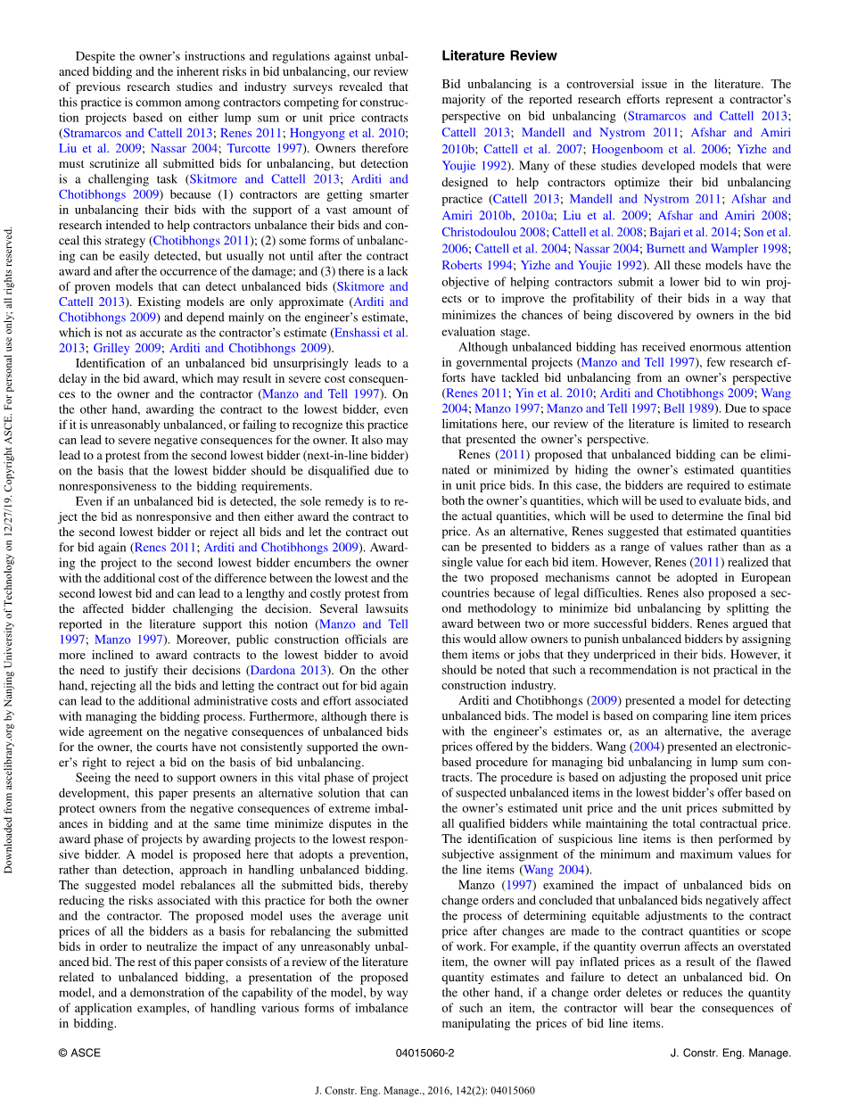 风险也是如此。尽管业主的指示和规定反对不平衡投标和投标不平衡的内在风险,我们的审查以前的研究和行业调查显示这种做法在以包干价或单价合同为基础竞争建筑项目的承包商中很常见。因此,所有者必须仔细检查所有提交的投标不平衡,但检测是一项具有挑战性的任务因为(1)承包商越来越聪明在大量资金的支持下使他们的出价失去平衡旨在帮助承包商平衡其投标并隐藏这一策略的研究;(2)某些形式的不平衡很容易被发现,但通常要等到合同签订之后损害发生后的赔偿金和赔偿金;以及(3)缺乏赔偿金能够检测不平衡出价的成熟模型。现有模型仅为近似值,主要取决于工程师的估计,这不如承包商的估计准确。