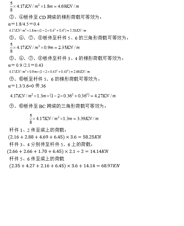③、④板传至杆件1,2的三角形荷载可等效为:
