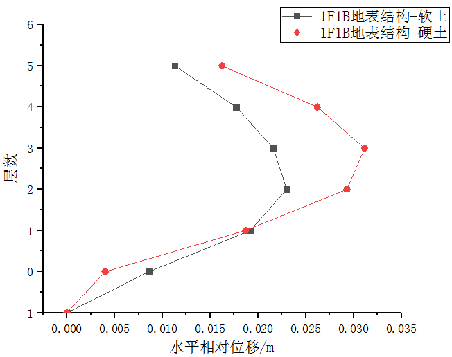 ② The influence of the underground structure on the surface structure in the hard soil site is significantly greater than that in the soft soil site.