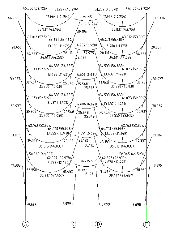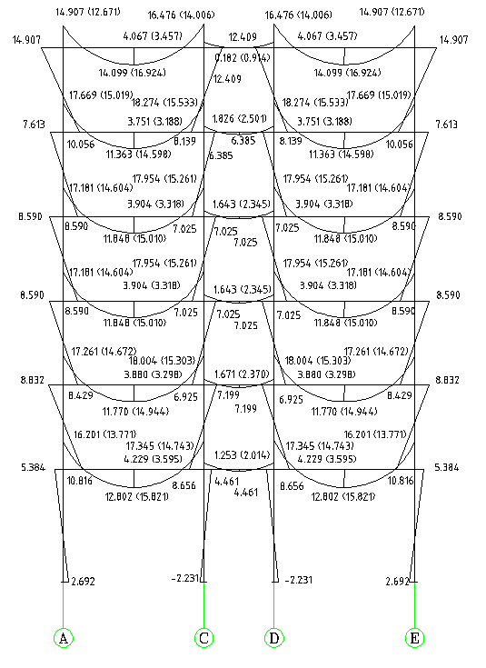 本设计中选用一榀框架为计算单元,考虑建筑的荷载情况,并分析其受力,计算出其在不同荷载情况下的弯矩、剪力、和轴力。然后进行内力组合,挑选出对构件的最不利组合进行截面承载力计算并配筋,保证结构具有足够的强度和稳定性。由于本次计算为手算,为方便计算采用了简化计算的方法。对于竖向荷载计算采用了弯矩二次分配法,其计算工作量小,精度可以满足工程需要。对于水平荷载计算采用了