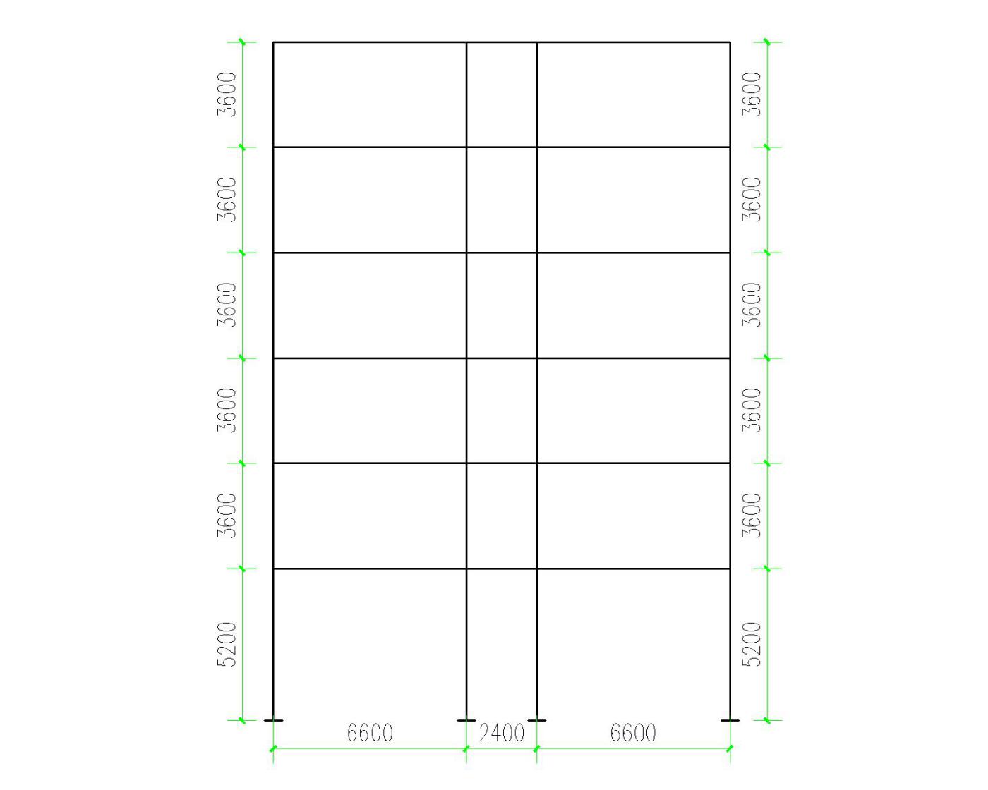 取④轴上的一榀框架计算。一榀横向平面框架的计算简图如图2.2所示,取顶层柱的截面形心线作为框架柱的轴线,梁轴线取至板底,2-6层柱计算高度即为层高,取3.6m,底层柱计算高度取至基础顶面,室内外高差为0.50m,基础顶面至室外地坪通常取0.50m,即 h1=4.2 0.5 0.5=5.2m.