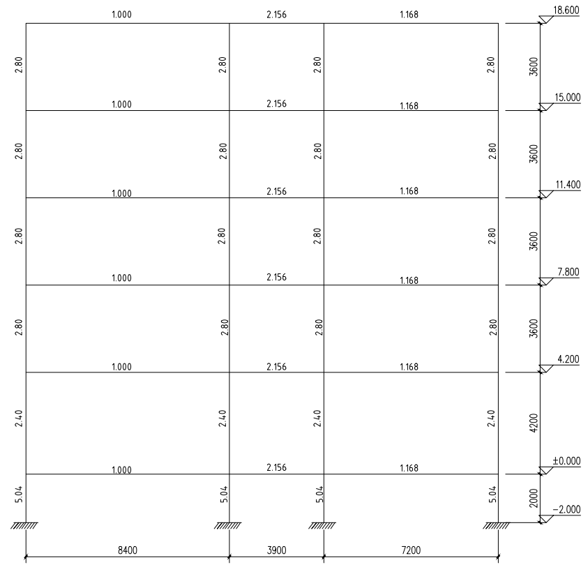框架结构的计算单元如图3.2所示,取⑦轴上的一榀框架计算。假定框架柱嵌固于基础顶面,框架梁与柱刚接。由于各层柱的截面尺寸不变,故框架梁长度等于柱截面形心轴线之间的距离。底层柱高从基础顶面算至一层楼面,基顶标高根据地质条件、室内外高差,定为-2.0m,二层楼面标高为4.2m。其余各层柱高从楼面算至上一层楼面,故均为3.9m,计算单元立面示意图如图3.3所示。