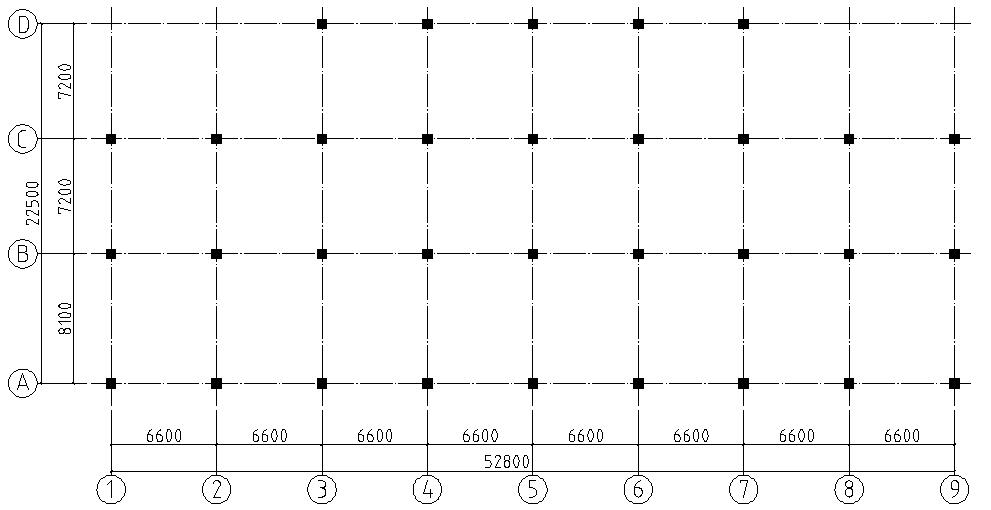 柱网布置对称,由于结构纵向跨度较长,结构采用横向承重方式,以提高建筑的横向抗侧刚度。