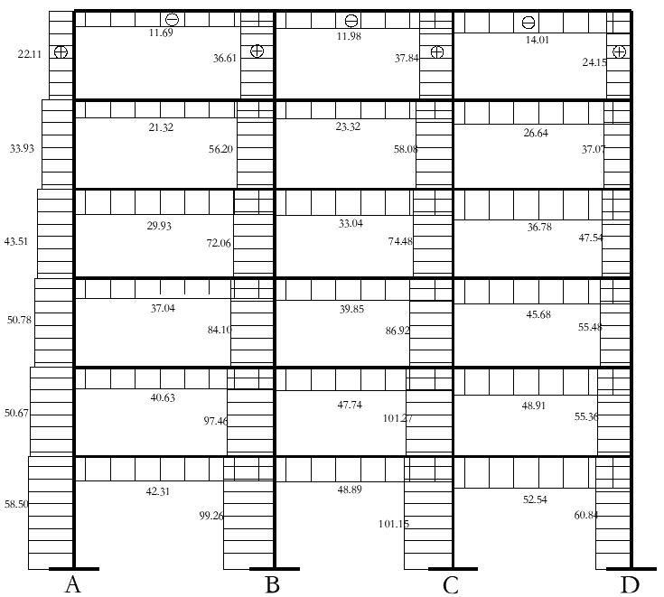 结构设计是对结构做计算分析。依据建筑设计,首先确定结构布置为横向承重方式。再取中间一榀横向框架进行手算分析。前四章完成构件尺寸的估算、梁柱线刚度的计算以及荷载统计。第五章利用底部剪力法得出水平地震作用,利用D值法解出水平荷载作用下结构内力。第六章采用弯矩二次分配法完成竖向荷载下结构内力计算。第七章内力组合参考荷载规范,共考虑八种组合包括十四种工况,对梁柱内力进行组合并选出最不利组合。最后对梁、柱、板进行配筋计算以及完成楼梯和基础的设计。