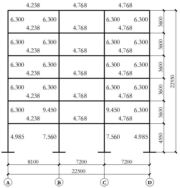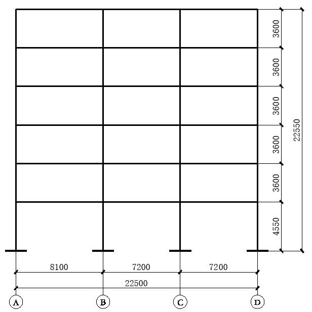 按照要求取⑤轴横向平面框架进行分析,其计算简如图2-2。在计算简图中,梁、柱构件均用单线条表示,柱轴线取其截面形心线,梁轴线取板面。底层柱高自基础底面取至一层楼面,其它层柱高取层高。即4.2 0.15 1.1-0.9=4.55m。