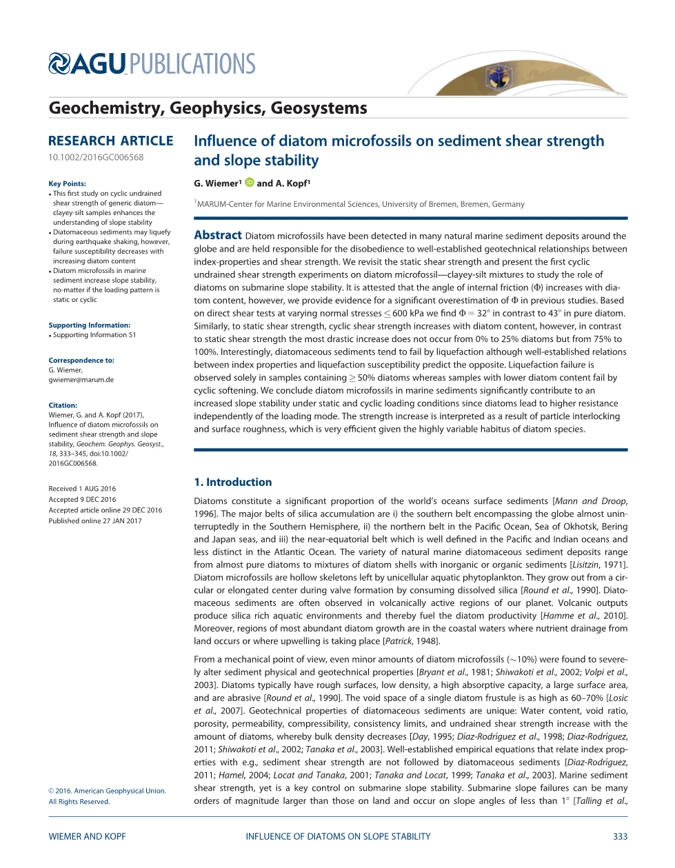 从力学角度看,即使是少量的硅藻微化石(10%)也会严重改变沉积物的物理和岩土性质。硅藻表面粗糙,密度低,吸收能力强,比表面积大,是磨料。单个硅藻硅藻的孔隙空间高达60-70% 。硅藻土的岩土特性是独特的:含水量、孔隙率、孔隙度、渗透率、可压缩性、稠度极限、不排水剪切强度随硅藻数量的增加而增加,其中体积密度降低。我们建立了与指数支撑相关的已建立的经验方程,即沉积物抗剪强度不受硅藻沉积的海洋沉积物剪切强度的影响,是海底边坡稳定性的关键控制因素。海底边坡的破坏程度比陆地上的要大很多,并且在小于18的坡度上发生。由于它们的体积和长时间的运行,它们会破坏重要的海底基础设施,并可能产生破坏性的海啸。一些大体积(大于)次海洋边坡的破坏已在具有硅藻沉积物的地区被发现。考虑到世界范围内硅藻土的广泛分布,以及对深海开采的经济利益的增加,了解它们的地质力学行为是非常重要的,以便为边坡稳定性提供更可靠的模型。
