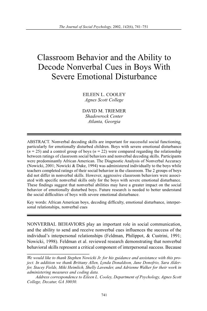 严重情绪障碍男孩课堂行为和解读非语言性暗示的能力外文翻译资料