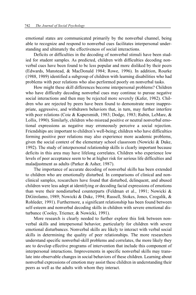 解读非语言这一能力的重要性已经扩展到情绪障碍的儿童。在临床和非临床的样本比较中,研究人员发现,与没有情绪障碍的对照组相比较,那些有情绪障碍、过失和受到虐待的儿童不擅于识别或解读面部情绪表情Feldman等人, 1991; Nowicki amp; DiGirolamo, 1989; Nowicki amp; Duke, 1994; Russell, Stokes, Jones, Czogalik, amp; Rohleder, 1991)。此外,在严重情绪障碍的儿童中,自尊和非语言性解读能力之间存在着重要的关系(Cooley, Triemer, amp; Nowicki, 1991)。