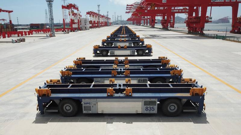 自动化集装箱码头水平运输设备主要有两种:一种是采用AGV作为水平运输设备;另一种则采用人工驾驶的跨运车。目前全球最大的自动化集装箱码头——上海洋山港四期自动化码头采用的就是上海振华重工研制的AGV,除了常规AGV拥有的特点以外,还拥有故障诊断、电量监控等智能化功能。如图2.3所示为洋山港四期自动化码头投入使用的AGV。