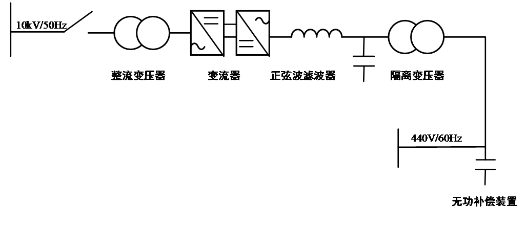 船舶岸电电源系统主要包括以下几个组成部分:整流变压器、变流器、正弦滤波器、输出隔离变压器和无功功率补偿装置等,船舶岸电电源系统的组成部分如图2.1所示。