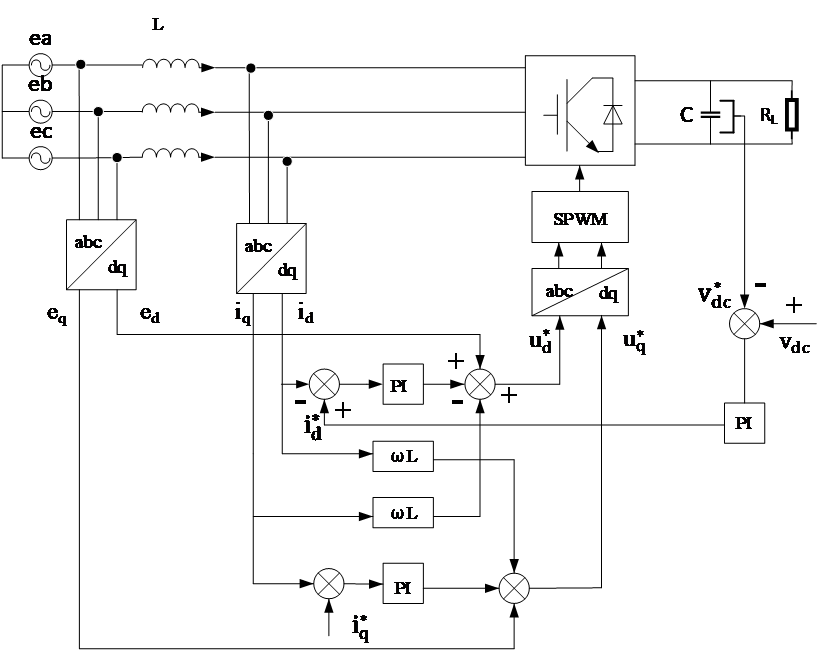 (2)针对电流的控制策略。该控制策略是对船舶岸电整流系统交流侧电流进行控制。该策略的实现方式又分为两种,一种是直接电流控制,另一种是间接电流控制。前一种控制方式是通过对船舶岸电整流系统直流侧电流的实际值和给定值进行比较后给出控制信号直接对船舶岸电整流系统交流侧的电流进行控制。第二种控制方式是通过控制船舶岸电整流系统交流侧电压值从而间接实现对船舶岸电整流系统交流侧电流的控制。直接电流控制相对于间电流接控制,实现起来较为简单,而且系统具有更好的稳定性和动态性能,所以本文采用的是直接电流控制策略对船舶岸电整流系统进研究。