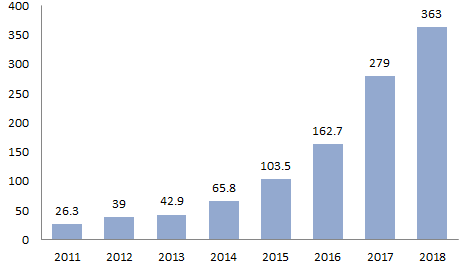 图1.1 2011-2018中国海上风机装机容量
