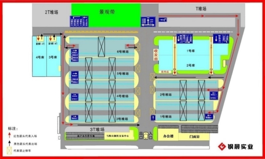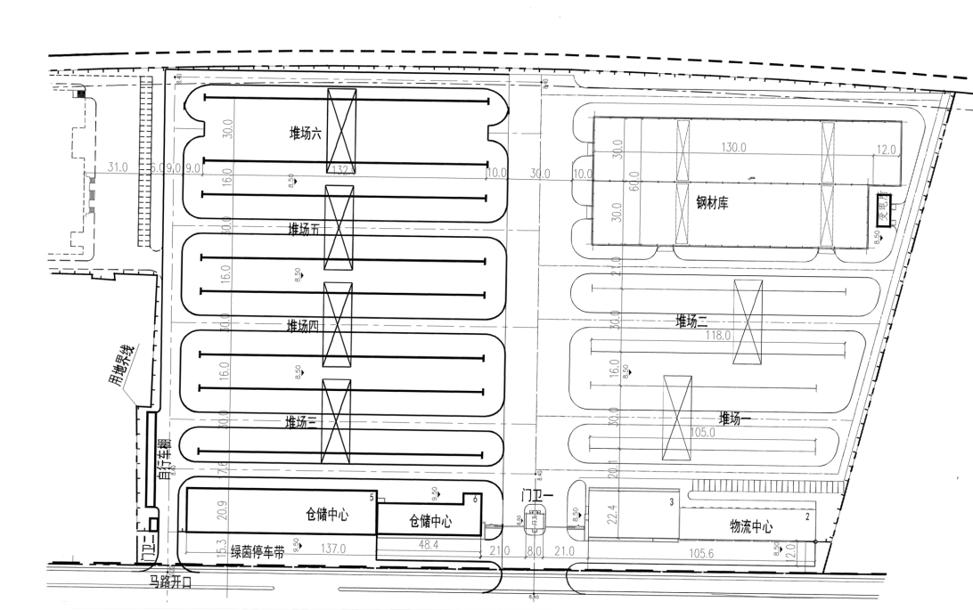 件杂货又叫件杂货物,简称件货或者杂货,英文叫general cargo,即为普通货物。件杂货还可以分为包装货和未包装货,包装货就是可以用包、袋、箱等包装起来进行运输的货物,未包装货就是没有包装或者无法包装的货物,采取相应的运输措施后直接运输。现在钢铁堆场存在着运输车辆排队和货物堆存方式不合理等影响较大的问题。货场运输车辆较多,货物堆存位置的影响使得物流园区内的作业秩序受到较大的影响,各堆场的设备和空间利用率差别较大,因此对此类钢铁堆场重新进行适当的优化调整显得十分必要,对于这类问题我们针对不同的货物提出不同的分配策略进行相应的设计和仿真,进而在不同的货物分配策略下找到适合此堆场的货物分配策略来解决当前最主要的矛盾和问题。所以在遵循货物存取基本原则下,对堆场内部各设施的利用情况进行优化使堆场容纳量进一步优化,从而使各作业单元效能均衡化,使运输设备在堆场内停留时间尽可能减少。通过借鉴相关研究人员对件杂货堆场和集装箱堆场货物堆存方式的研究,我们提出不同的堆存方式,研究在不同的堆存方式下各类货物的分类和存放问题,从而找到适合当前堆场存取方式的最佳方案。钢铁物流园区的实景图和平面图如下图所示:
