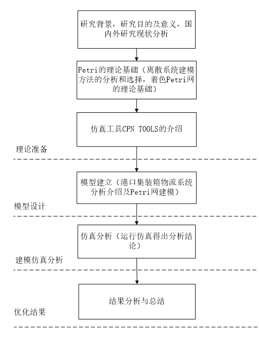 本论文在研究国内外相关港口集装箱物流系统论文的基础上,回顾Petri网建模方法理论并学习CPN Tools建模软件,针对港口集装箱物流系统,构建相应的着色Petri网模型,通过CPN Tools将构建好的着色Petri网模型进行仿真分析,将分析结果进行优化。图1.1为论文研究的基本路线。