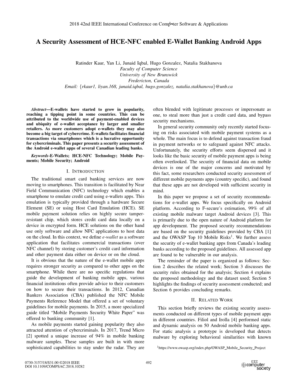 本文提出了一套电子钱包应用安全的建议,该建议主要针对Android平台。根据F-secure的评估,99%的现有移动恶意软件以Android设备为目标[3]。这主要是由于Android平台对于应用程序开发的开放性。我们提出的安全建议是基于CBA[1]提供的安全指南和OWASP“移动风险前十排行榜(Top 10 Mobile Risks)”。根据提出的指南中的内容,我们进一步评估加拿大主要银行的电子钱包银行应用程序的安全性。在我们的分析中,我们发现所有参与评估的应用都是脆弱的。