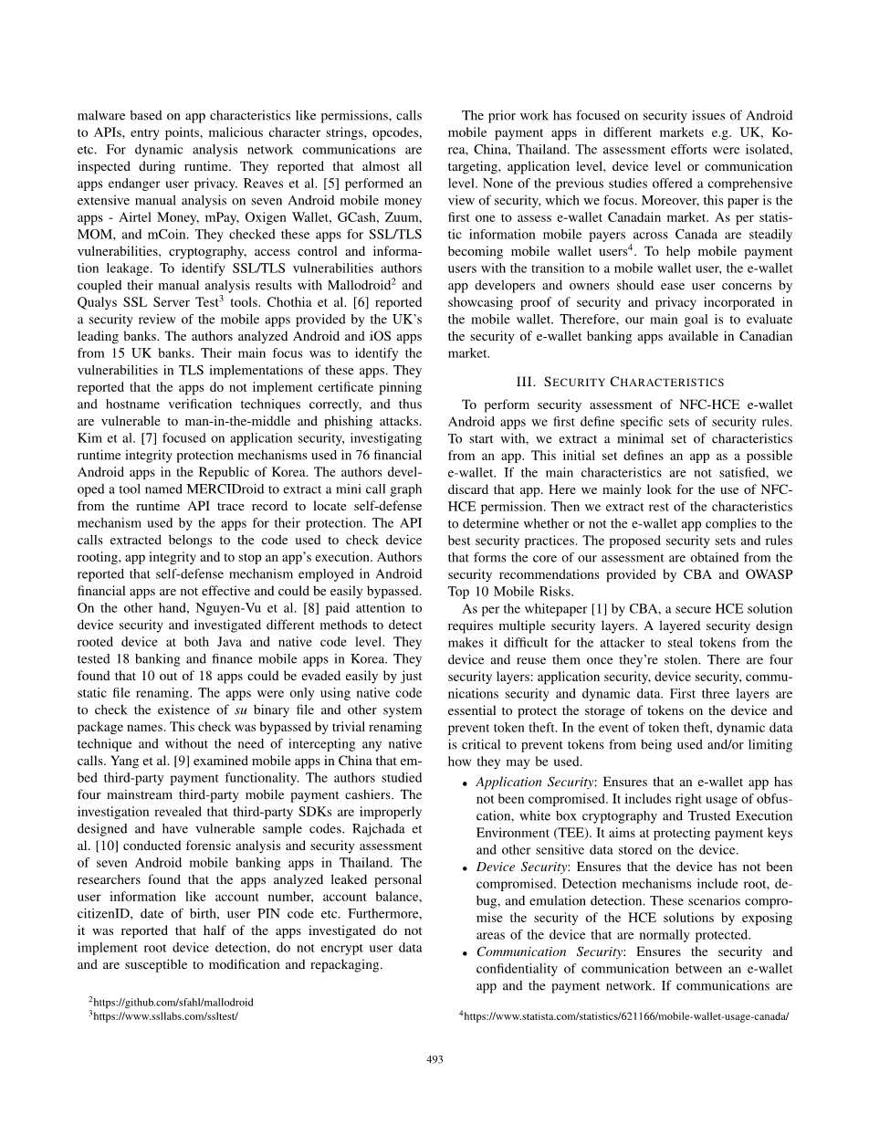 前人在这方面的研究重点是Android移动支付应用程序在不同市场的安全问题,如英国、科雷亚、中国、泰国,其评估工作是孤立的、有针对性的,处于应用程序级别、设备级别或通信级别。以往的研究都没有提供一个综合的安全观,而这正是我们研究的重点。此外,本文也是第一篇评估电子钱包在加拿大市场的文章。根据统计信息,加拿大各地的移动支付者正在稳步成为移动钱包用户4。为了帮助移动支付用户过渡到移动钱包用户,电子钱包应用程序开发人员和所有者应该通过展示移动钱包中运用的安全和隐私证明来缓解用户的担忧。因此,我们的主要目标是评估电子钱包银行应用程序在加拿大市场的安全性。