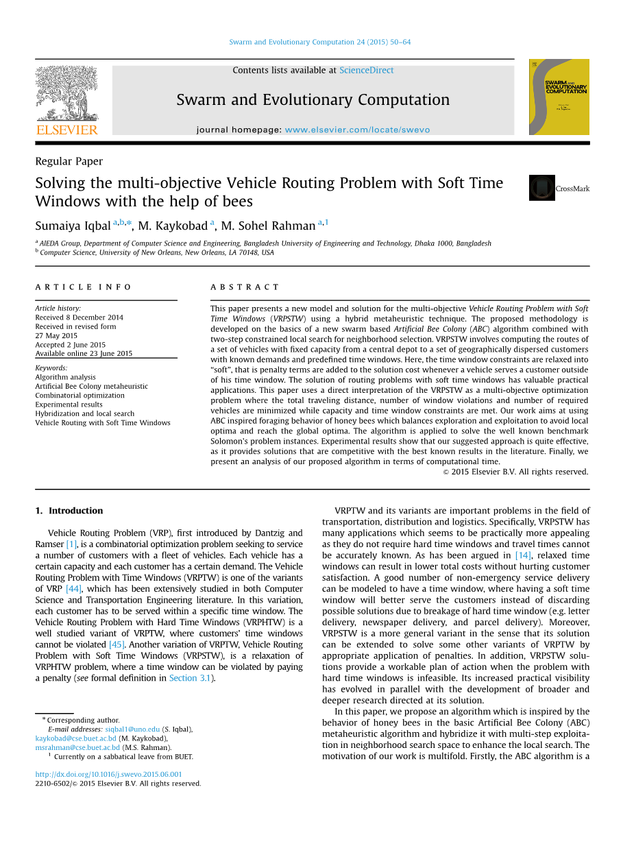 最近在不同的硬组合问题上应用ABC元启发式算法得到了很好的解决方案(例如,叶片约束最小生成树问题[18],广义分配问题[19],核心燃料管理优化问题[20],旅行销售员问题[21]和数独问题 [22])。增强的基于Pareto的人工蜂群(EPABC)算法[23]可用来解决多目标的作业车间软调度问题。在[24]中提出了离散人工蜂群(DABC)算法,迭代贪婪(IG)和迭代局部搜索(ILS)来解决流动调度问题,两位刘姓学者 [25]提出了一种混合离散人工蜂群(HDABC) 使用基于Nawaz Enscore Ham(NEH)启发式的随机自适应搜索程序(GRASP)来解决置换流车间调度问题的算法。混沌搜索ABC(CABC)算法用于[26]模拟PID(比例 - 积分衍生)控制参数调整和离散人工蜂群(DABC)算法在[27]中被提出,以解决批量流媒体流量车间调度问题。ABC算法用于解决多目标灵活作业车间调度问题[28],随机资源约束项目调度问题(RCPSP)[29]以及发现交通信号的最优设置[15]。最近,ABC算法用于解决具有时间窗(VRPTW)的经典车辆路径问题,其中时间窗约束很难被保持[46]。在这项工作中,ABC算法以矢量评估方法实现,以开发VRPTW的多目标解决方案模型。