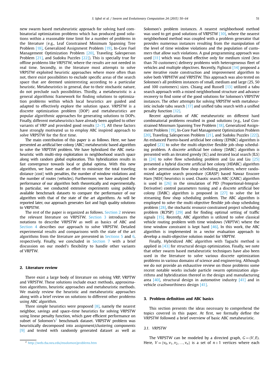 本文的其余部分安排如下。第2节回顾了有关VRPSTW的相关文献。第3节介绍了描述VRPSTW的符号以及ABC的基础知识,第4节描述了我们解决VRPSTW的方法。详细的实验结果和与文献中现有技术的比较分别在第5节和第6节中给出。最后,我们在第7节中总结了我们模型处理VRPTW其他变体的灵活性的简短讨论。