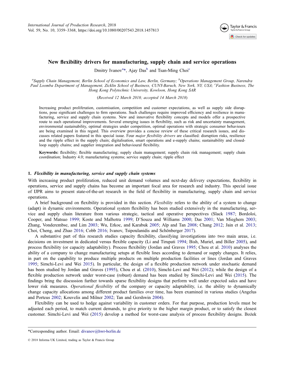 IJPR的这期特刊探讨了各种柔性驱动因素,这些驱动因素来源于信息技术,业务分析和增材制造等领域的新进展。 在柔性能力的一般背景下,这个特刊还在精益管理、新颖的定量技术、弹性和风险管理方面产生了新的想法。