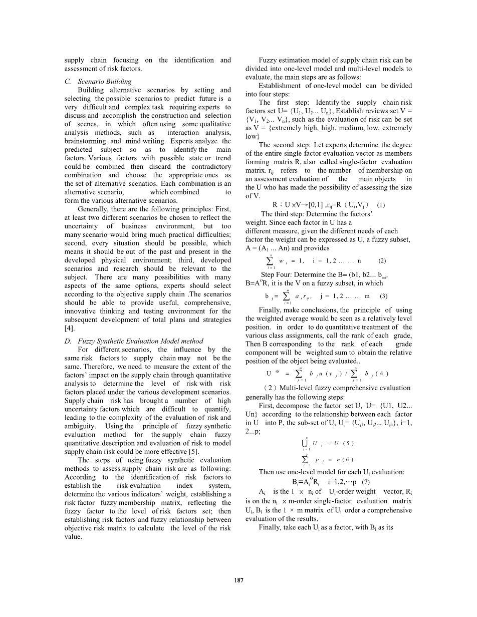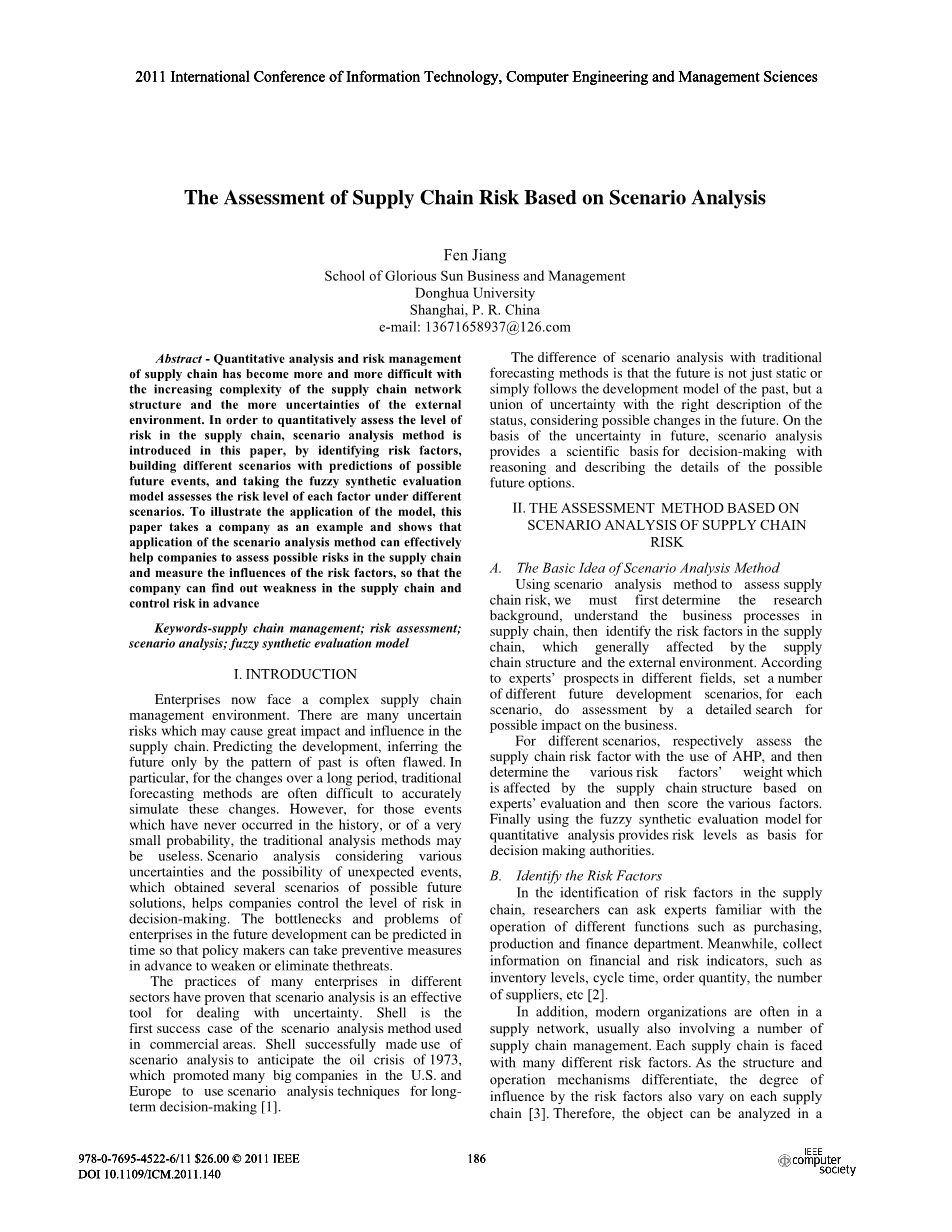 摘要-随着供应链网络结构的日益复杂和外部环境的不确定性增加,供应链的定量分析和风险管理变得越来越困难。为了定量评估供应链的风险水平,介绍了情景分析方法,通过识别风险因素,构建不同的场景预测将来可能发生的情况,并以模糊综合评价模型评估每个因素在不同的场景的风险水平。为了说明模型的应用,本文以一个公司为例,表明应用场景分析方法可以有效地帮助企业评估在供应链和测量风险因素的影响的过程中可能的风险,从而 ,公司可以提前在供应链中找出弱点和控制风险。